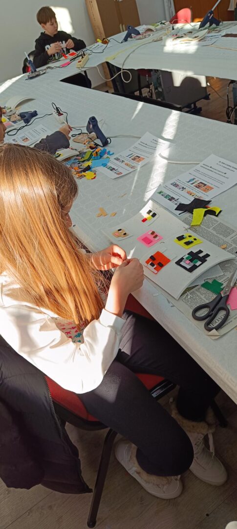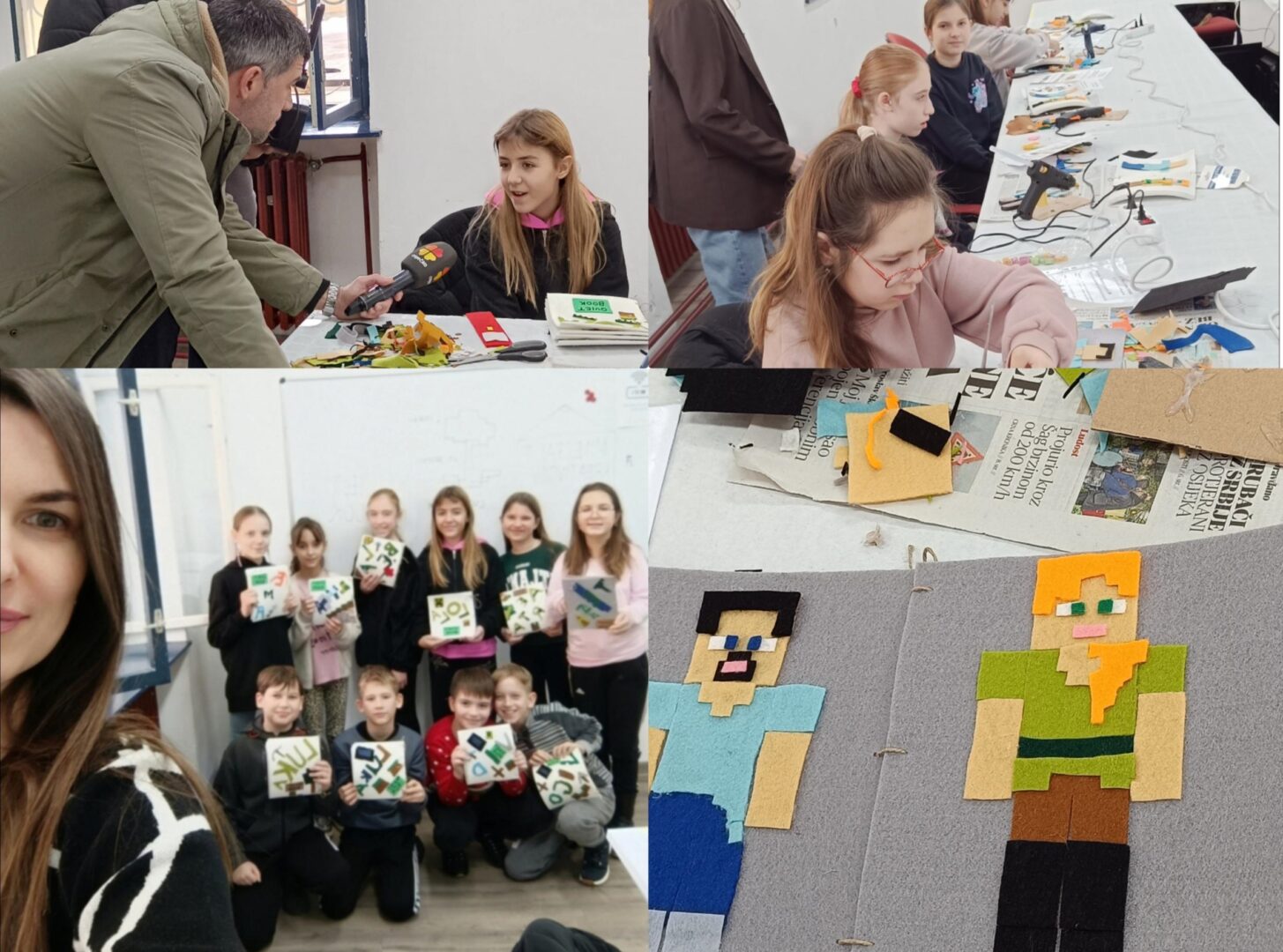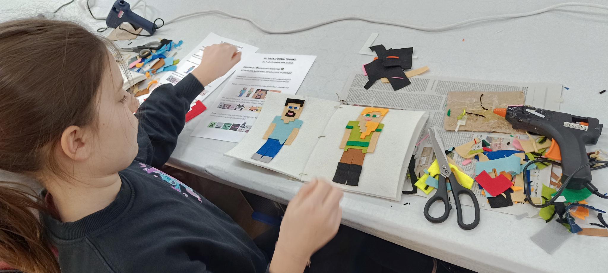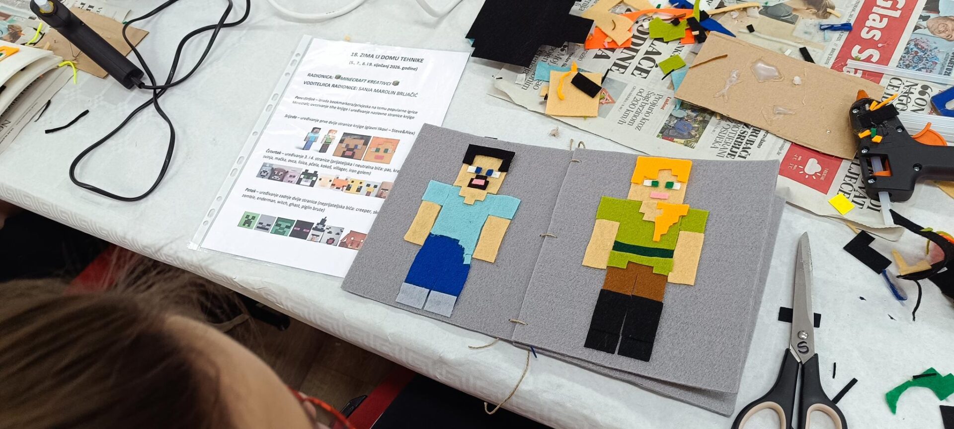 I ove je godine određeni broj učenika naše škole odlučio dio svojih zimskih praznika provesti u kreativnoj atmosferi Zime u Domu tehnike, 18. po redu. Uz već poznate radionice, ove je zime posjetiteljima posebno zanimljiva bila radionica “Minecraft kreativci”, na kojoj su učenici osnovnih škola razvijali finu motoriku izrađujući privjeske, bookmarkere i “tihu knjigu” od tri vrste raznobojnog filca s likovima iz popularne računalne igrice “Minecraft”. Djeca su radila sa škarama, šilom i vrućim ljepilom, a radionicu je vodila naša nastavnica tehničke kulture Sanja Marolin Brljačić. Jedna od polaznica, ujedno i učenica naše škole, novinarima je objasnila što je zapravo “Minecraft”. “To je igrica u kojoj se vodi borba za preživljavanje, a ima i creative mode, u kojem možemo graditi što želimo, a to je najbolje, jer možemo biti kreativni”, rekla je Tesa te pokazala svoju tihu knjigu s glavnim likovima Minecrafta, Alexom i Steveom.