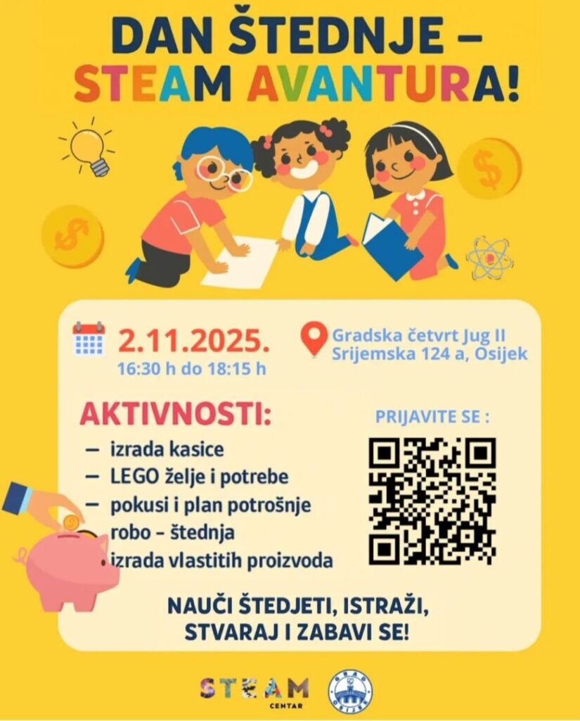 STEAM centar Osijek vas poziva na zanimljive aktivnosti povodom Dana štednje 2.11.2025. u Gradskoj četvrti Jug 2 (Srijemska 124a), u vremenu od 16:30 do 18:15 h. Aktivnosti su namijenjene djeci od 7 do 10 godina, a jednu od radionica vodi i naša nastavnica TK. Pridružite se i saznajte kako aktivnosti financijske pismenosti mogu biti jako zabavne.