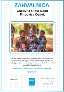 Posebno ističemo humanitarnu akciju prikupljanja sredstava, u kojoj su učenici pokazali iznimnu kreativnost i angažman. Zahvaljujući zajedničkom trudu učenika, nastavnika i roditelja, ostvareni su značajni rezultati, prikupljeno je 2760 eura, koji će doprinijeti osiguravanju školskih obroka za više od 125 djece za kuhinju koja je otvorena u Malaviju, a dobila je ime “Marijini obroci Hrvatska”.